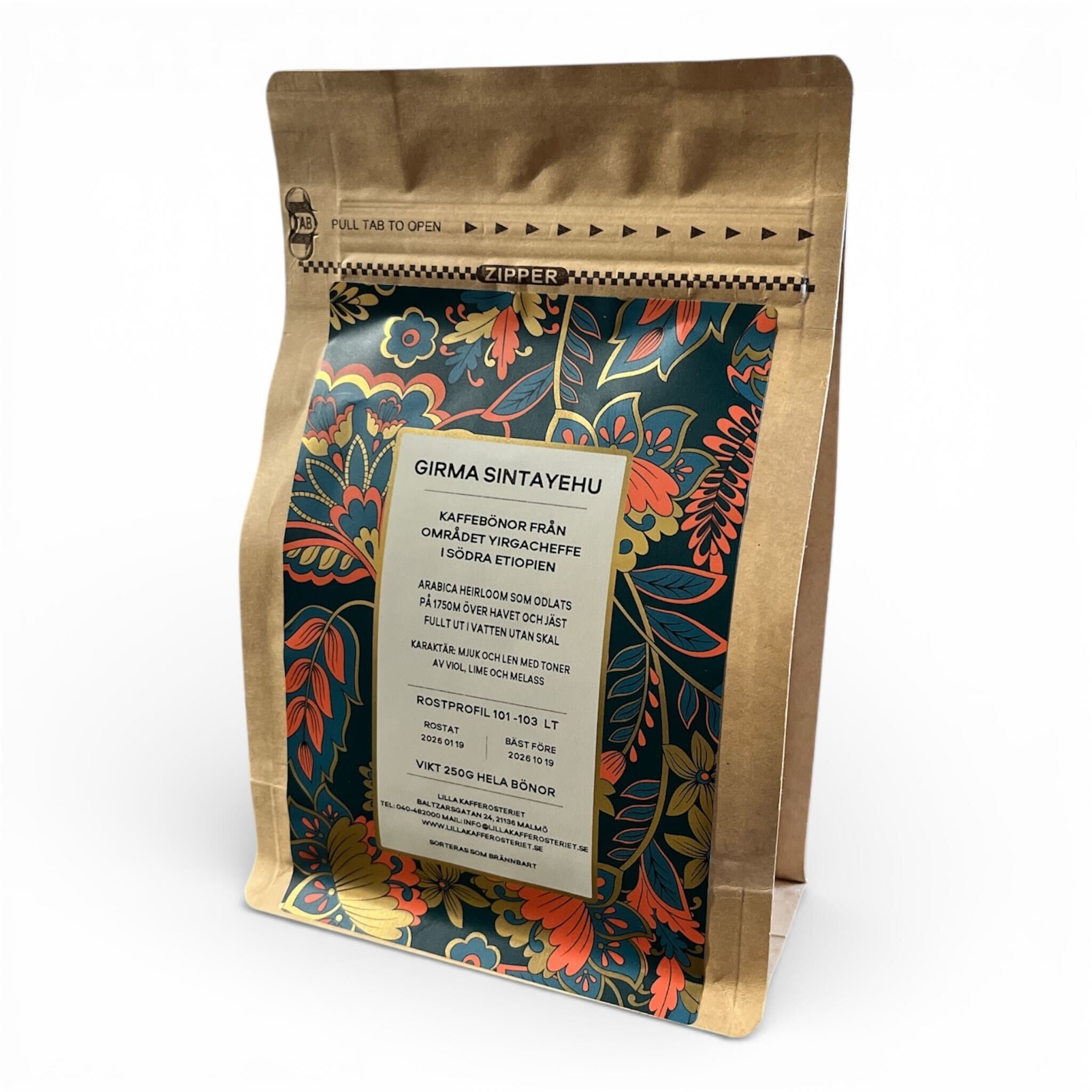 Girma Sentayehu är en andra generationens kaffeproducent som driver sin gård tillsammans med sin fru och son i Yirgacheffe-regionen. På en höjd av 1 750 meter över havet är hans 6,46 hektar stora gård berikad av rödbrun lerjord och riklig skugga från inhemska träd.