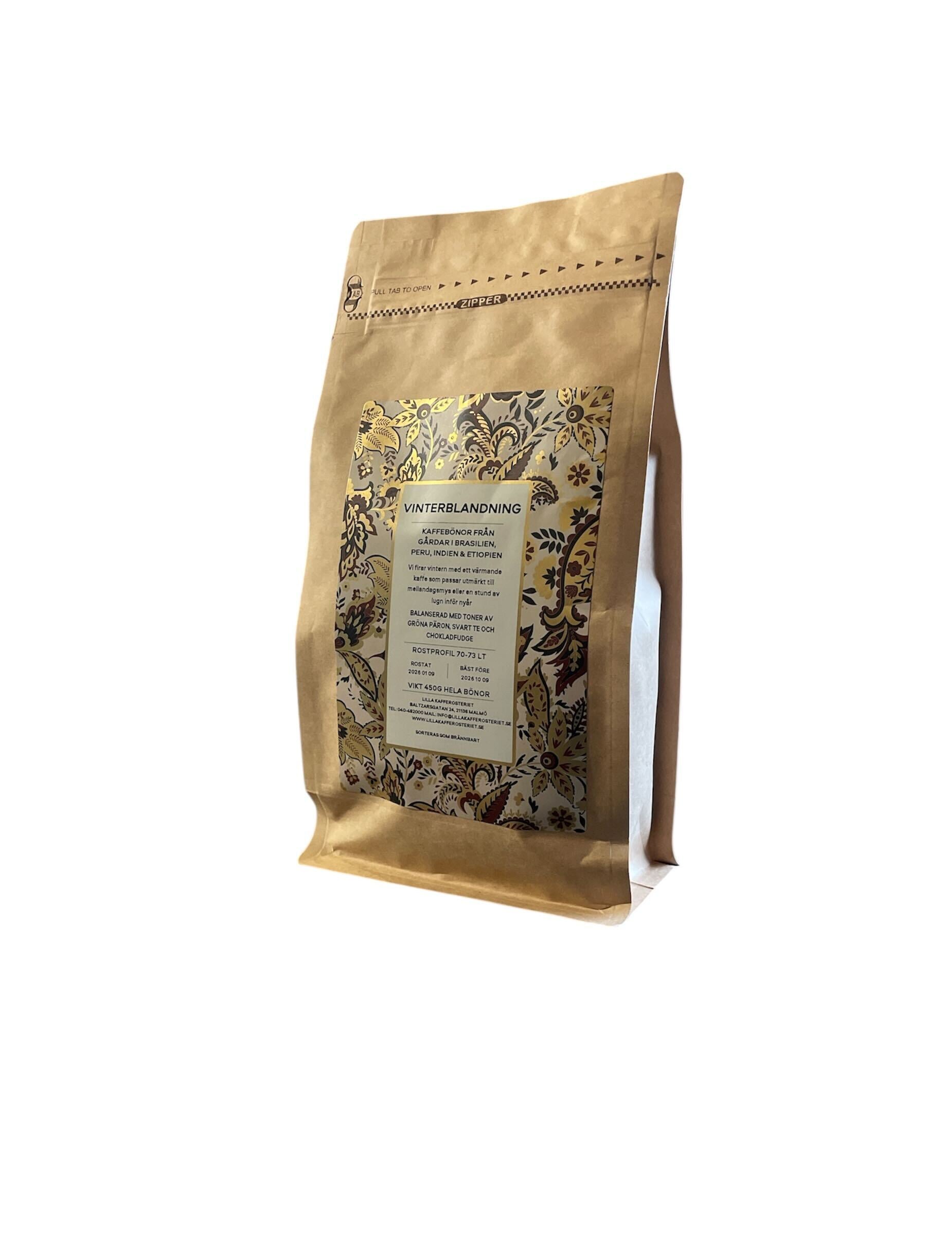 Vinterblandning 450g 175 kr Hela kaffebönor Kvarnat till filterbryggning Kvarnat till presskanna Kvarnat till moka Lägg i varukorgen Årets Vinterkaffe är en blandning på kaffe från gårdar i Brasilien, Peru, Indien & Etiopien. Smakprofilen är ett balanserat kaffe med toner av gröna päron, svart te och chokladfudge. Passar utmärkt till julbaket eller en mysig stund vid brasan. Kolla in fler produkter
